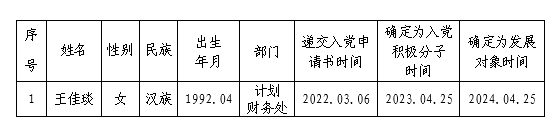 经基层党组织培养考察,拟接收以下1名同志为中共预备党员,现将名单予以公示,如有异议,请以书面或口头方式向党委组织部或机关党委反映。