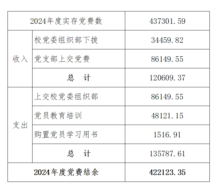 2023年底党费余额437301.59元。2024机关党委党费收入共计120609.37元,其中各党支部上交86149.55元,校党委划拨34459.82元。2024年全年党费支出共计135787.61元,其中,上缴学校党委组织部86149.55元,党员教育培训共计48121.15元,购置党员学习用书1516.91元。