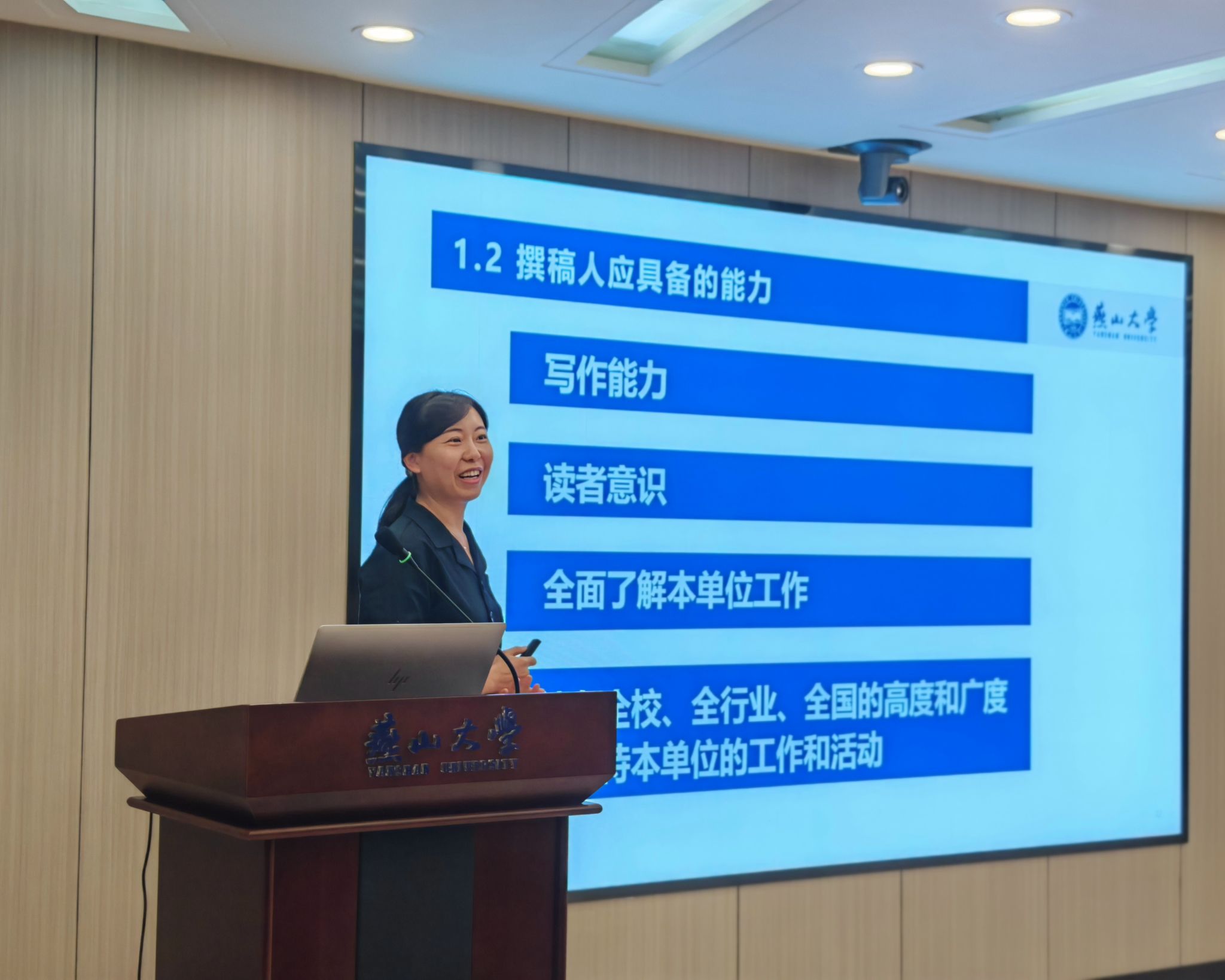 党委宣传部正科级干事王晓宁以《校园新闻的撰写、校园新闻的拍摄》为题开展讲座。在新闻写作环节,王晓宁结合多年从业经验,围绕撰稿人应具备的能力、新闻结构搭建、语言表达等核心要素进行系统讲解,通过剖析优秀新闻案例与常见写作误区,引导大家掌握校园新闻写作技巧。在新闻摄影部分,她从构图技巧、景别运用等方面入手,结合机关工作场景实例,详细讲解了会议、活动、人物等不同题材的拍摄要点。