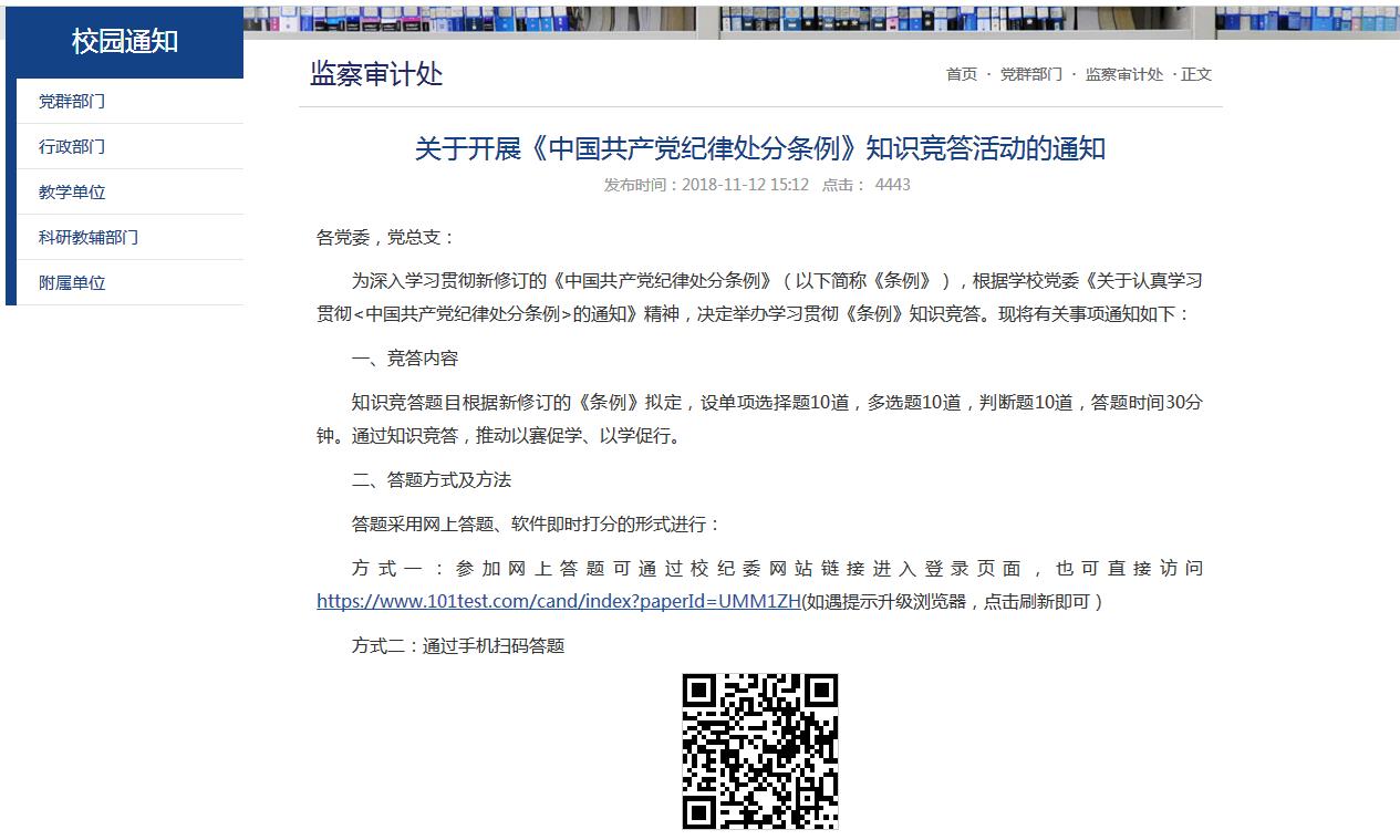 监察审计处为机关科级及以上党员干部发放了新《条例》学习手册。机关各支部积极开展新《条例》专题学习,各单位结合工作实际,围绕新《条例》开展形式多样的学习讨论,并根据实际学习情况,提交了学习报告。2018年11月19日邀请我校纪委副书记、监察审计处处长张明从新《条例》的修订背景、修订主要内容、修订的重大意义三方面进行了深入详细的解读。为确保新《条例》学习取得实效,入脑入心,举办了一次新《条例》知识网上竞答活动,广大师生共870余人积极踊跃参与竞答。最后评出了一、二、三等奖各若干名。