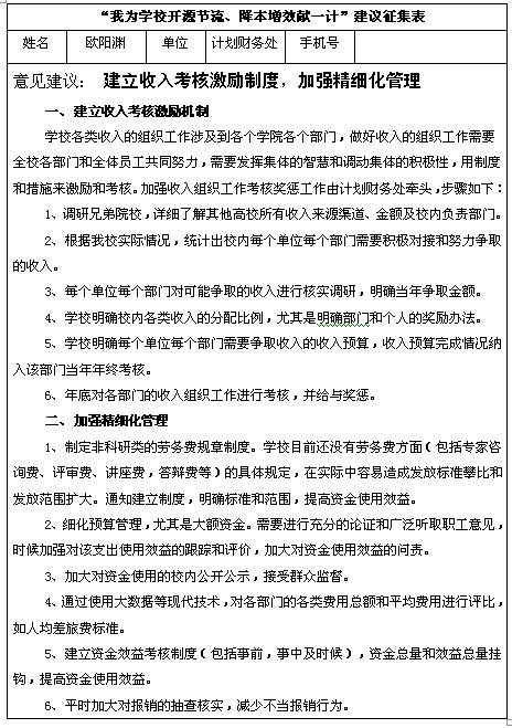 此项活动的开展为机关职工提供了一个思考并探索的平台,机关各部处积极参与,集思广益,群策群力。本活动既是向广大职工征集建议的一次机会,也是向广大职工宣传节约意识的一次良机。2018年10月26日至11月15日活动期间,计划财务处党支部共收到了70份意见建议,其中具有创新性的优秀建议有26份。建议内容非常丰富,从开源到节流,从宏观到微观,从奖励到惩处,从制度到习惯等等方面,这些建议为今后学校开源节流和降本增效工作指出了努力的方向和需要改进的地方,有些近期可以实施的建议将融入到财务工作当中,落到实处,见到实效。