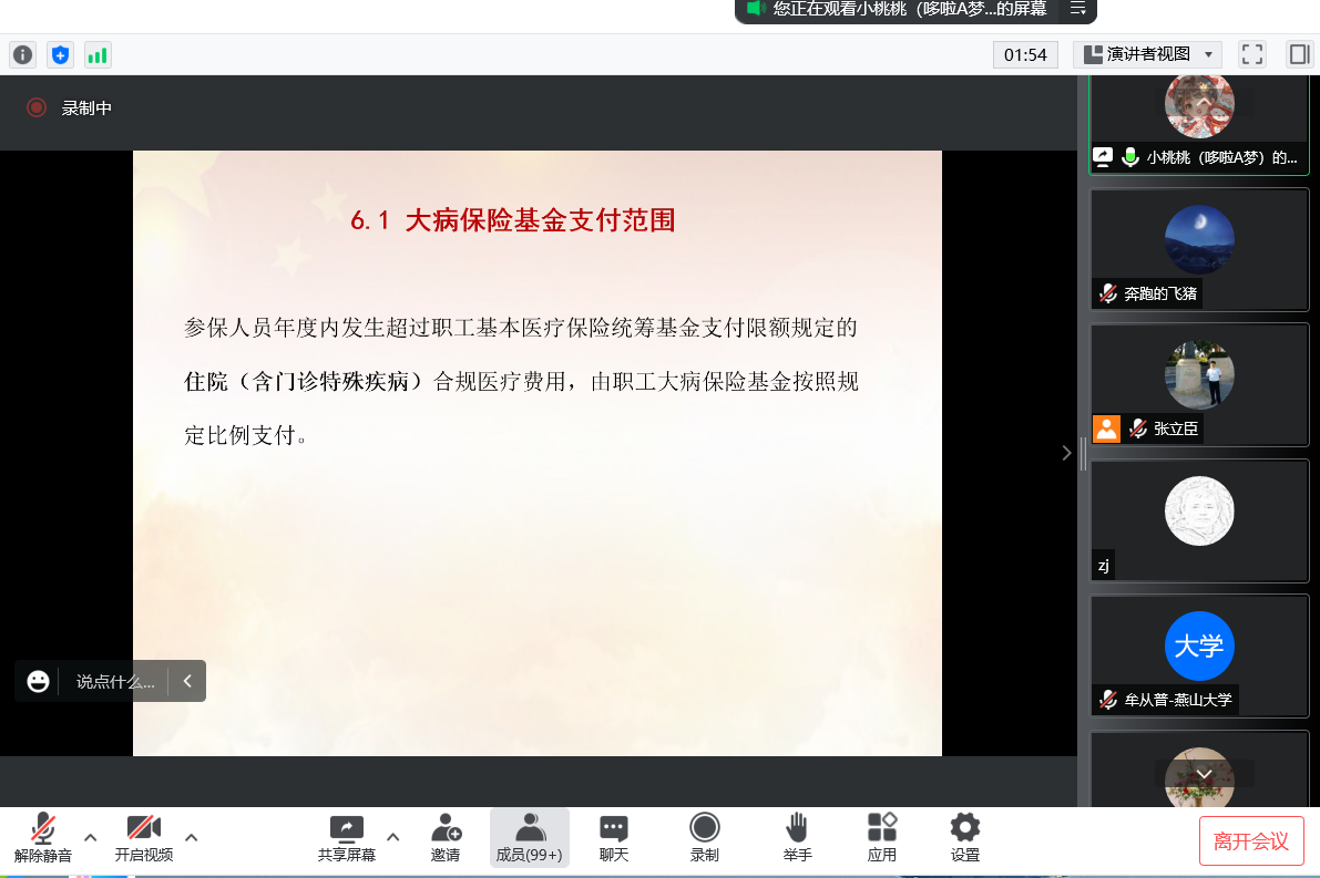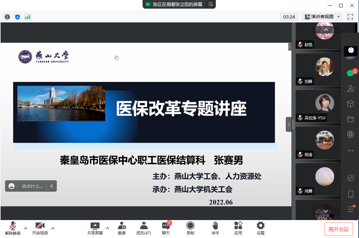为帮助广大教职工进一步了解医保改革政策,6月10日15:00校工会联合人力资源处特别邀请秦皇岛市医保中心职工医保结算科张赛男讲解有关普通门诊、门诊慢特病、住院、大额保险等方面的改革措施。本次讲座采取线上讲座形式,由机关工会承办,机关工会主席张立臣主持本次讲座。