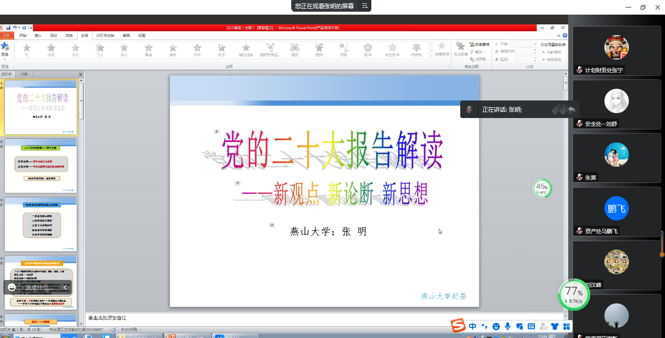 为深入学习贯彻党的二十大精神,深刻认识新时代新征程中国共产党的历史使命,明确学习重点和目标任务,促推学校高质量发展,机关工会于12月8日下午三点,邀请校纪委副书记、监察处处长张明作了题为《党的二十大报告解读——新观点 新论断 新思想》的专题讲座。机关工会会员积极参加。