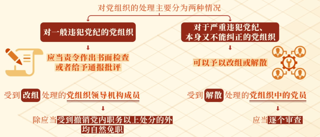 根据《中国共产党纪律处分条例》规定,对党组织的处理主要分为两种情况:对一般违犯党纪的党组织,上级党组织应当责令其作出书面检查或者给予通报批评;对于严重违犯党纪、本身又不能纠正的党组织,上一级党的委员会在查明核实后,根据情节的严重程度,可以予以改组或解散。